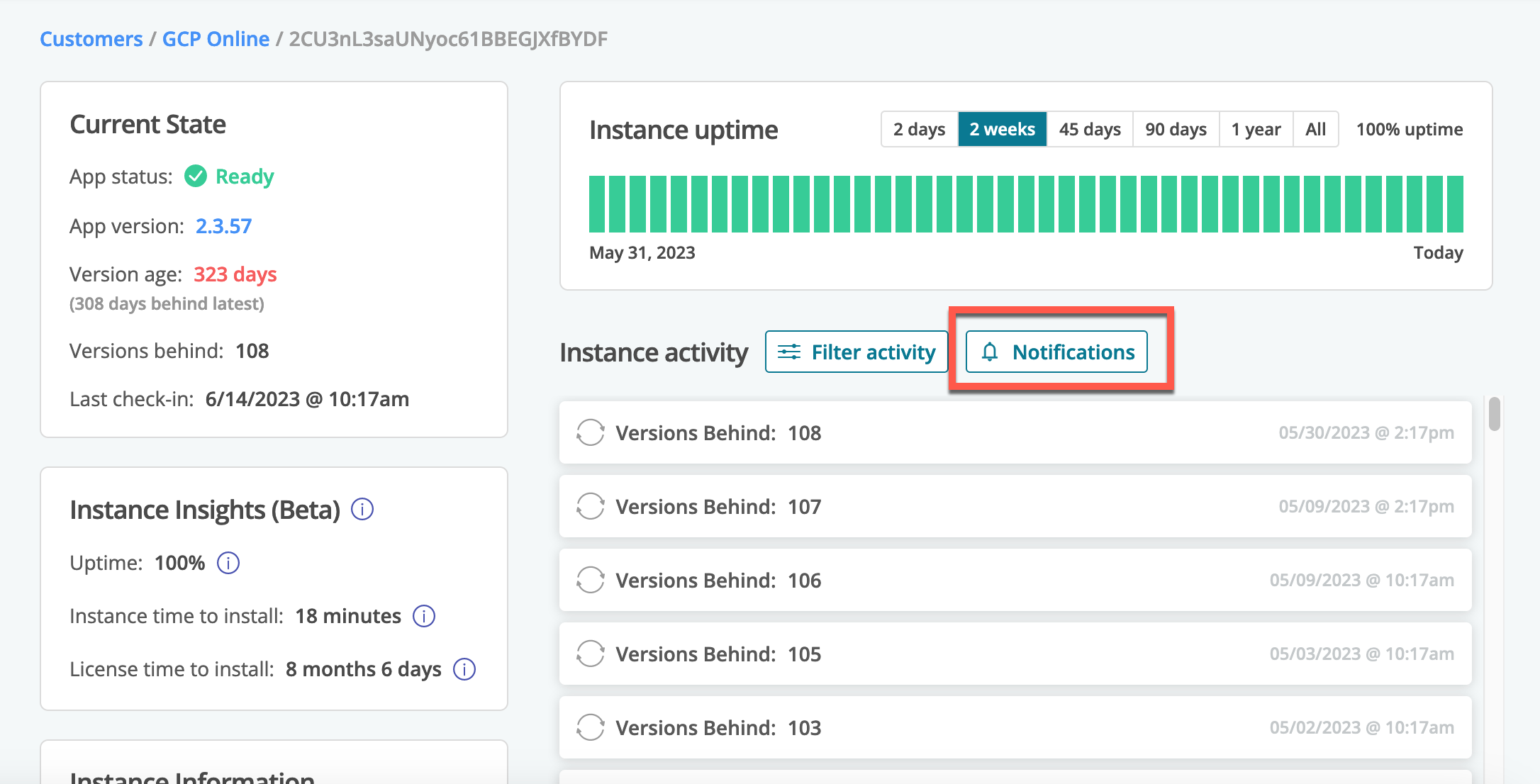 Go to Applications > Customers, and click an active customer instance that you want to receive notifications for.